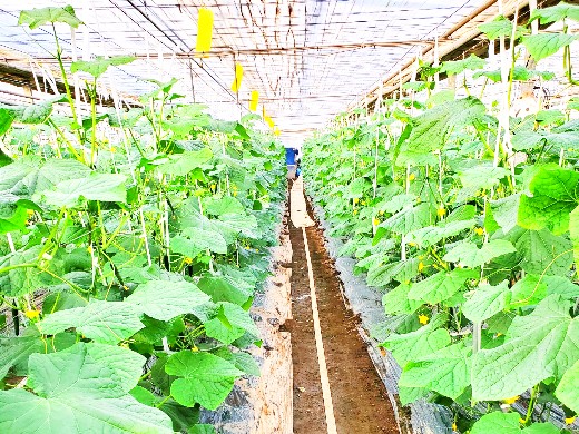複合環境制御装置により灌水や温度、CO2濃度管理の自動化を実現。女性でも楽にコンテナを運べるオリジナル台車やトロッコの利用による効率的な収穫作業、循環扇やカーテン多層化による省エネなど、作業の省力化に取り組んでいます。こうして生産された高品質なきゅうりは前橋市内の学校給食などにも使用されています。"