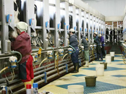牛から牛乳を搾るミルキングパーラー(16頭W)を導入しており、腰を痛めずに作業ができます。この部屋に牛を誘導し、搾乳を行っていきます。乳房は病気になりやすいため、雑菌などが入らないように、衛生管理に気を使いながら仕事をしています。