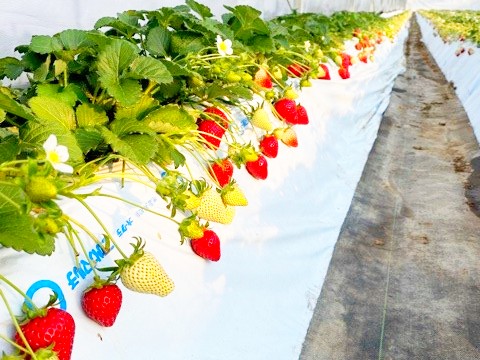 地域で行われている従来のいちご栽培と比較して、農薬使用回数・化学肥料窒素使用量の双方を1/5ほどに抑えています。これからも環境にやさしく、安心で安全、おいしいいちごを生産していきたいと考えています。