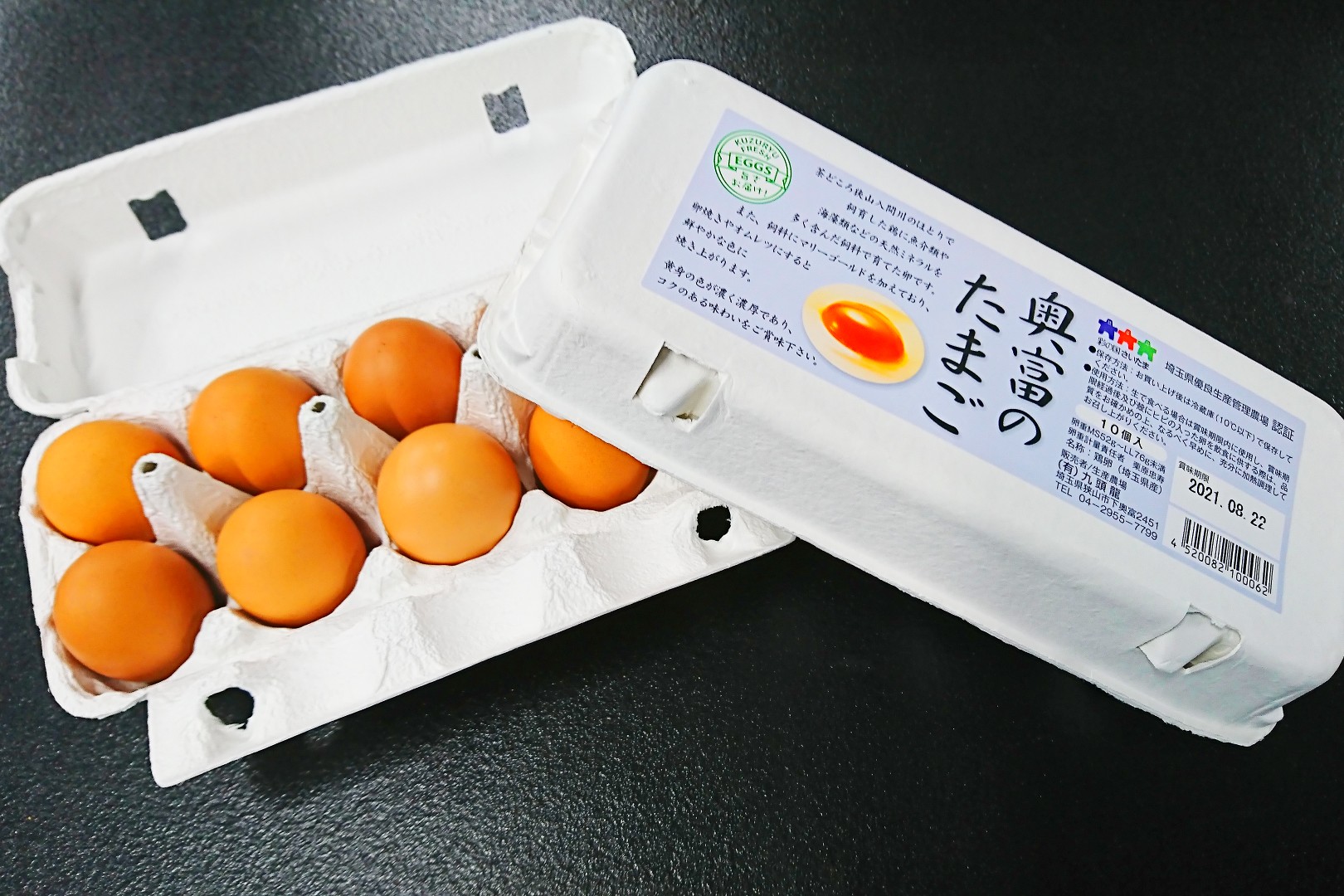 入間川のほとりという環境を活かし、おいしい地下水で鶏たちを育てています。飼料には天然ミネラルやマリーゴールド、ウコン粉末、乳酸菌、酵母菌など20種類を配合した「奥富のたまご」は、黄身の色が濃厚で、コクのある味わいが特徴。卵焼きやオムレツにすると鮮やかな色に焼き上がります。