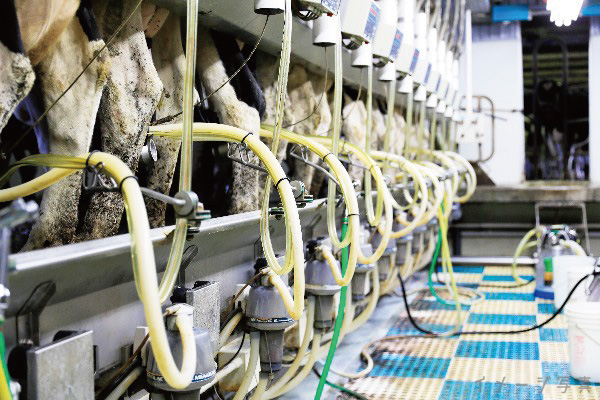 主な業務の一つである搾乳は、1日に2回行います。1度の24頭を搾乳できるミルキングパーラー(搾乳施設)など、設備の機械化・自動化を進めています。