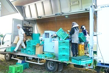50haという広大な圃場で生産を行うため、常に機械設備導入や効率化を行っています。写真は圃場に停めたトラック上の作業風景です。荷台で袋詰めを行うことで、短時間での出荷を実現しています。