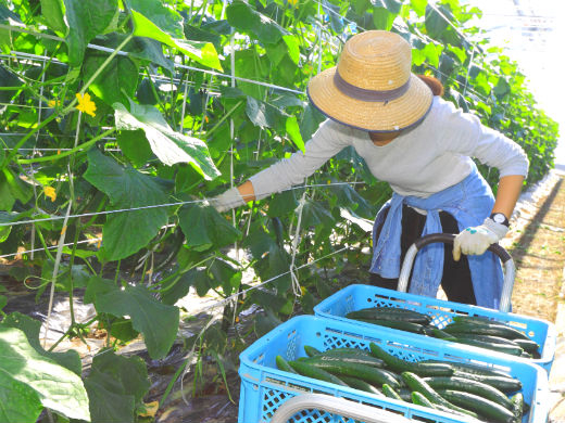お仕事は、きゅうり・にがうりの収穫や出荷作業、米・麦の栽培や収穫作業の補助などです。