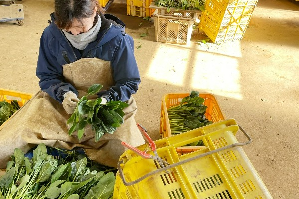 ・ほうれん草や水菜:下部の葉を落として綺麗にする作業