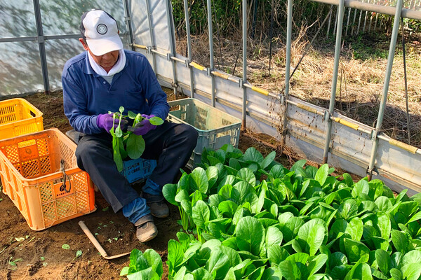 当農園の小松菜は、減農薬、減化学肥料にこだわった特別栽培。JAに共販出荷しています。安定的に出荷するのはとても大変ですが、安全でおいしい野菜を食べていただけるよう日々品質向上に努め、心を込めて栽培しています。