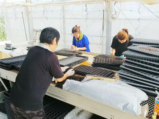 種まき、接ぎ木、出荷の作業を午前と午後に分けて行います。どの作業をいつ行うかについては、その日の状況で決めます。午前、午後にそれぞれ15分の休憩があります。