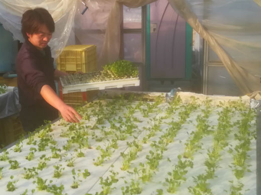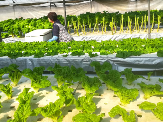 腰をかがめず作業が出来る栽培ベンチの上に、養分を含んだ水を流して育てる方法です。理想的な肥料設計をする為すくすく育ちます。水温を調整し、一年中栽培可能。泥はねがなく、きれいな野菜ができます。