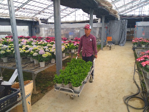 扱っているのは、美しい色が魅力のポインセチアとアジサイ。ピンク、ブルー、ホワイト、イエロー、パープルなどさまざまな色を育てています。