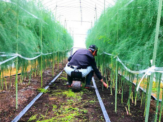 アスパラガスやミニトマトは、専用のハサミで手入れ・収穫作業を行っていただきます。写真の様に座りながら作業できるので、長時間しゃがみこむという事はありませんよ。男女問わず活躍できる環境です◎