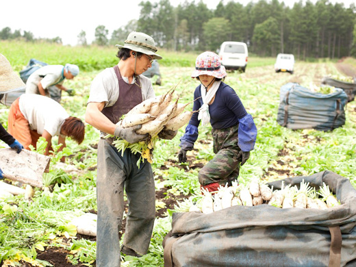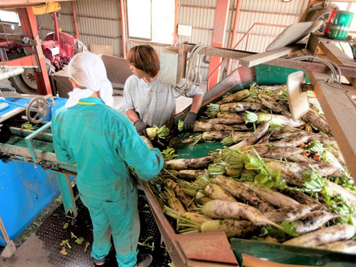 手掘りは大変というイメージがありますが、大根は力任せに抜くのではないので、力があればいいかというとそうではありません。華奢な方や女性の方でも作業は可能です。機械に乗り続けたり、選別をし続けるだけの仕事ではないので、体力はもちろん付きますし、気持ちのよい疲労感と大根を抜く爽快感を得られる仕事です。