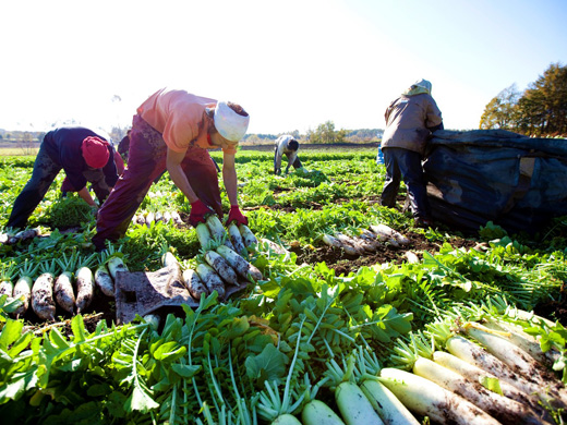 野矢農場では「百姓物語」というブランドで関西にしか出荷していないこだわりの大根を育てています。広大な大根畑で作業をするのはとても気持ちがいいですよ!