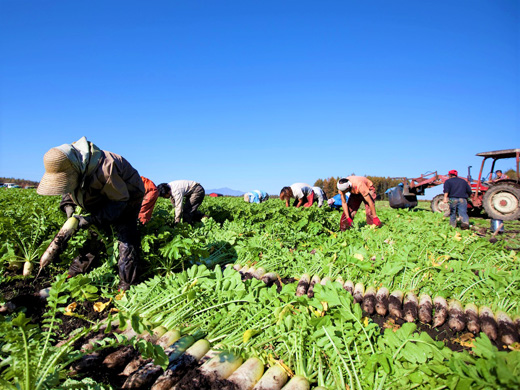 品質に厳しい「京都・大阪」に出荷しており、地元・北海道でも食べることができない大根を生産しています。大根の品質にはこだわっており、品質を確保するために、収穫は機械ではなく「手掘り」で行っています。元々は北海道東川町というところで大根を育てていましたが、良いものを作るためにはより適した場所(寒暖の差が激しく、夏もそれほど暑くならない冷涼な地域)で大根作りに励みたいと考え、ここ北海道更別村に農場を構えました。