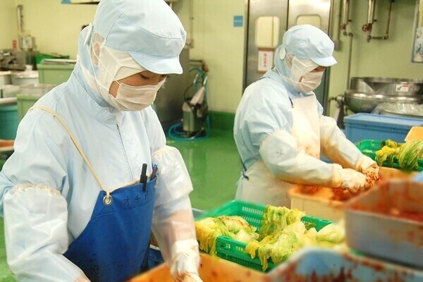 季節や気温に合わせて塩加減や発酵させる日数を調整するなど、安定した叙々苑の味と品質を守っています。白菜にヤンニョム(キムチの素)を塗り込む作業では、人の手で葉を一枚ずつめくって丁寧に塗り込むなど、機械では再現できない繊細な職人技で最高のおいしさを日々追求しています。