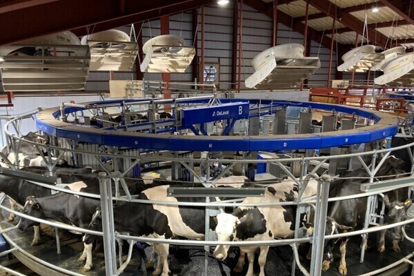 牧場では、乳牛が良質な生乳を生産し、元気な子牛を出産できるよう、牛舎の中で牛たちの健康に配慮しながら1頭にあたり1日3回の搾乳を行い、毎日出荷しています。ノベルズデーリィーファームは飼養頭数が約4,000頭(搾乳頭数:約3,000頭)と多いため、主にロータリーパーラーで搾乳業務を行います。山形の拠点では2024年夏より、ロータリー式自動搾乳ロボット(写真)も稼働しています。