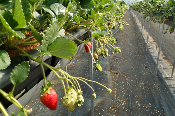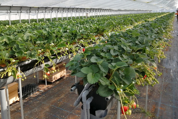 当農園では、ベンチアップした高設栽培でイチゴを育てています。腰ぐらいの高さにイチゴがあるため、作業時の体の負担が大幅に軽減されています。また、高設栽培では培養土を使うため、水や肥料の管理をより適切に行うことが可能。地面から離れているので清潔感があり、害虫による被害が少ないというメリットもあります。