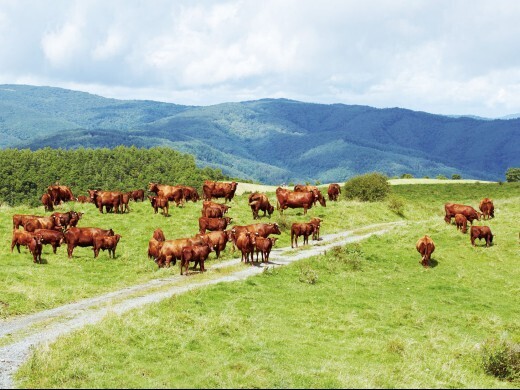 有名な岩泉ヨーグルトの原料である牛乳を生産する酪農をはじめ、私たちにお肉を提供してくれる、龍泉洞黒豚やいわいずみ短角牛なども飼われています。写真は日本国内の和牛全体の1%にも満たない希少な短角牛の放牧風景です。