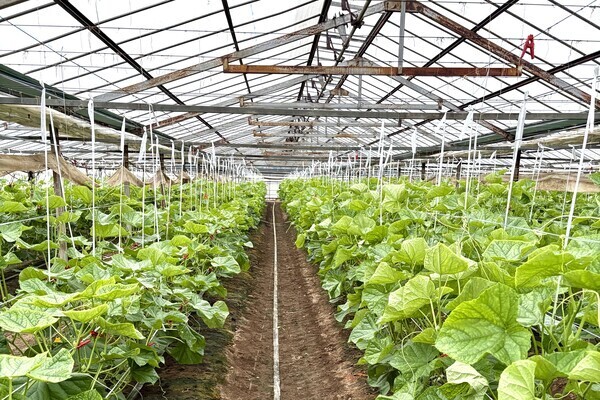 私たちはハウス2棟で、ITを活用した環境制御システムを導入し、スマート農業を実践しています。近隣では珍しい「つる降ろし栽培」という手法を採用しており、高品質なきゅうりを安定して生産しています。