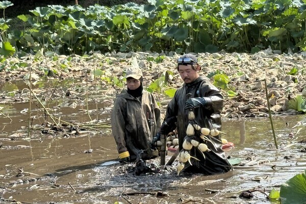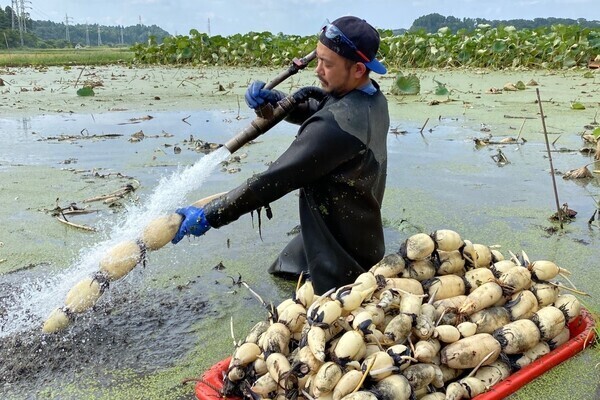 良質な土壌で作る「蛍れんこん」。短期集中で泥にまみれ、心地よい汗を流せる充実した仕事です。