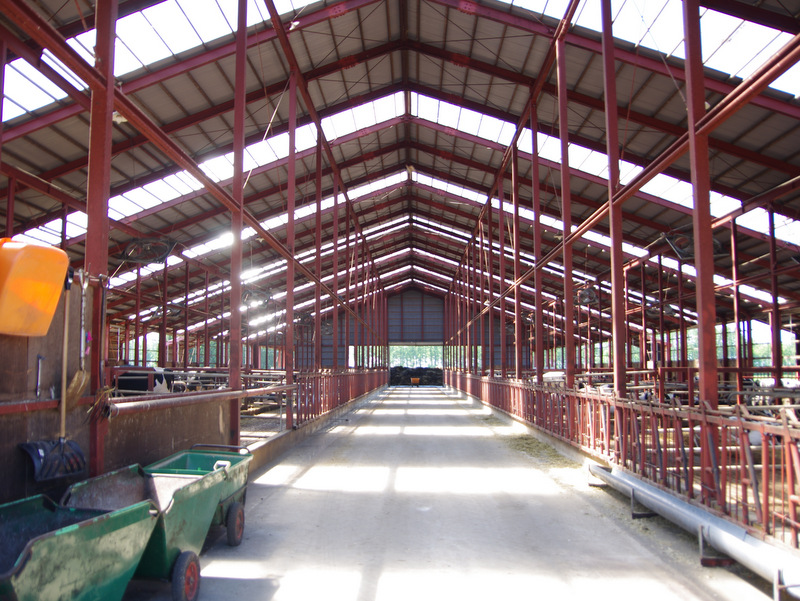 当牧場の牛舎です。風通しをよくしたり、乳牛のベッドを清潔に保つなど、快適に生活できるように衛生管理には気をつけています。