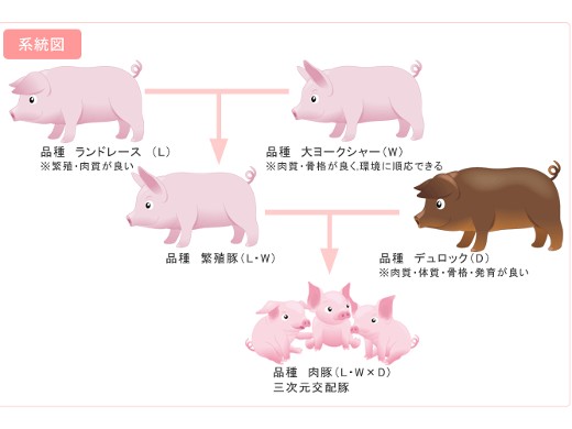 繁殖能力が高く肉質の良いランドレース種、肉質と骨格が良く環境への順応性の高い大ヨークシャー種、病気に強く肉質と発育の良いデュロック種の3種類を掛け合わせた「三元交配豚」を生産しています。発育状況に合わせた ビタミン・ミネラルの補強、栄養成分バランス等にも気を配った細かい飼料給与を行なうことで、定時・定量・高品質な豚肉の確保に努めています。