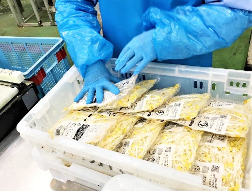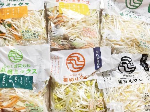 低価格でボリューム満点、栄養価も?いもやしは、?卓に?かすことのできない食材のひとつ。私たちが?場で?産したもやしは、グループ会社のスーパーを中?に、全国のスーパーや学校の給食、飲食店などのもとに届けられます。