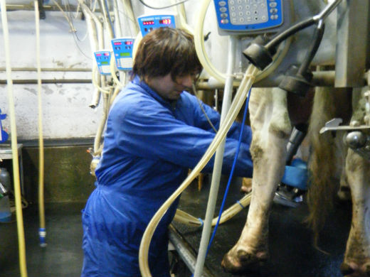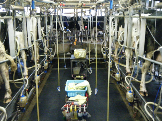 酪農の仕事の代表的なものが搾乳(乳搾り)です。ミルキングパーラーと呼ばれる搾乳機を使って効率良く搾ります。当牧場で搾った牛乳は低温殺菌処理の牛乳となるので、特に丁寧に行っています。"