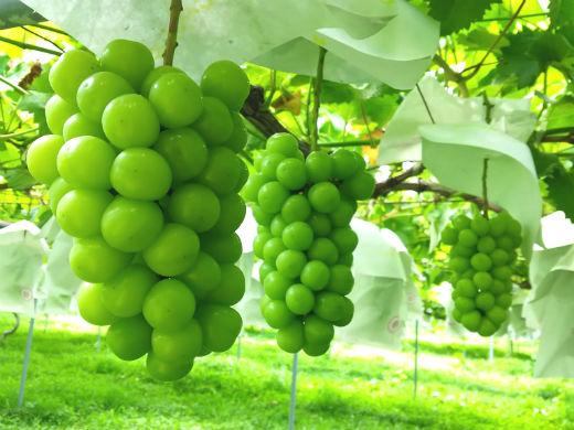 ブドウは、「シャインマスカット」「ブラックオリンピア」「藤稔」「ハニーシードレス」「黄玉」といった様々な品種を育てています。当農園のブドウは1粒1粒が大きく、甘くて美味しいと大変ご好評いただいています◎