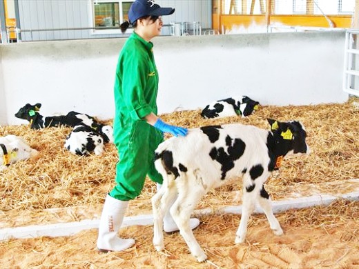 こちらは仔牛を誘導している様子です。敷料(牛のベッド)を交換するとはしゃいだり、給餌をすると喜んで近づいてきたりと、毎日とっても可愛い姿が見られます。