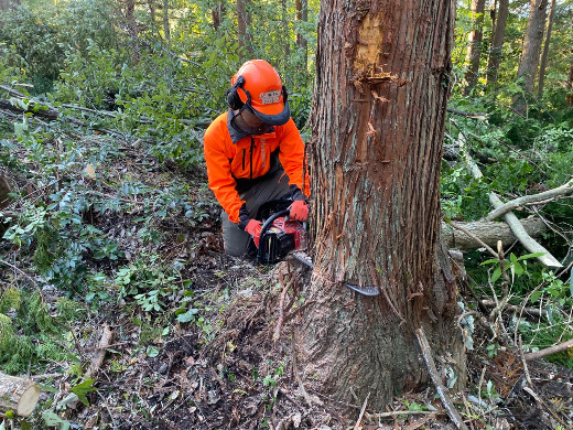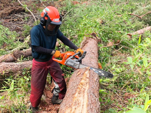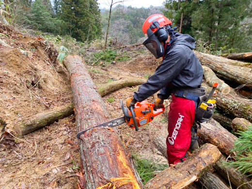 入社後は、重機・チェンソーを用いた山林の伐採作業をメインに行っていただきます。本人次第ではありますが、入社約5年で1つの作業班の班長になります。"
