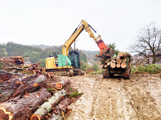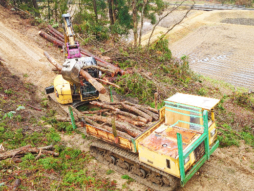 伐採には、状況に合わせて多くの重機と林業機械を使っているほか、少しでも生産性を高めるために、常に最新重機の試験・導入を行っています。作業道も山主の方達と相談し、しっかり整備することで、少ない人員・時間でも多くの木材を運び出し、伐採搬出のコストを削減しています。