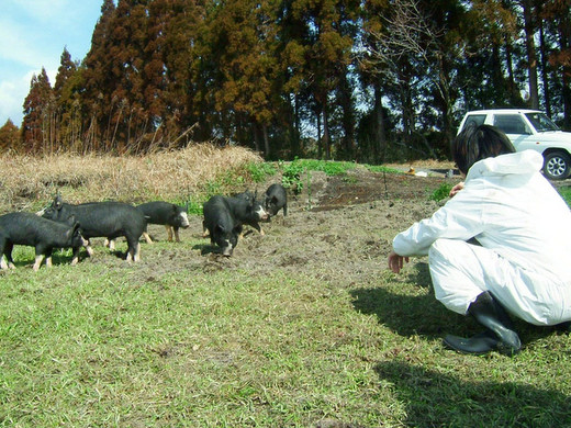 えこふぁーむでは、豚一頭当たり200㎡以上の面積で放牧しています。毎日、自由に野山を駆け回る、豚本来の姿で育つことで、ストレスもなく、元気にすくすく育ちます。 元気で健康な豚たちですから、与える飼料は自家生産で抗生物質や成長ホルモン剤、保存料などは一切使いません。