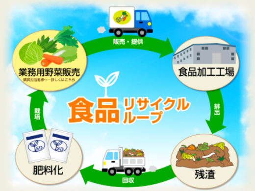 私たちの最大の特徴は、取引先である食品工場より排出された生ごみから、たい肥を製造し、それを用いて野菜を栽培し、また食品工場に納入する「食品リサイクルループ」を行っています。