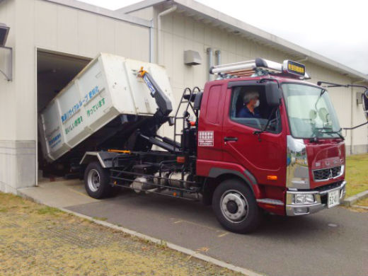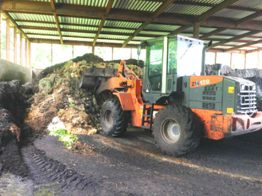 たい肥の製造はまず回収してきた再生資源物を自社工場へ搬入。大型機械にて計量し水分調整を行ったうえで大型スクリュー式攪拌機で発酵させます。