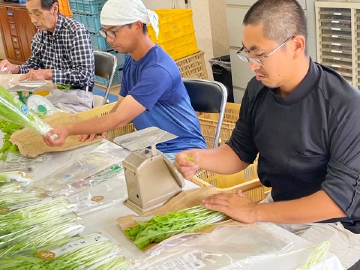 農園では、葉物野菜を中心にトマト・紫ずきん・ブルーベリー・栗・いちご・ナス・とうがらし類・冬野菜約4種類など季節に合わせて多品目経営を行い、JAや直売所・地元給食や卸売業者に納品をしています。