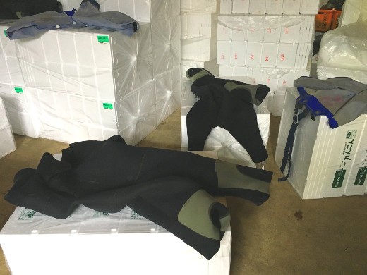 レンコン栽培は粘土質の土壌で行うため、専用の作業着があります。海でも使われるウエットスーツと同じ素材で出来ているので、冬の防寒対策もばっちりです。