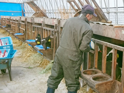 仔牛にミルクをあげている様子です。すくすく育つように、具合の悪い様子は無いかなど毎日しっかり観察しています。