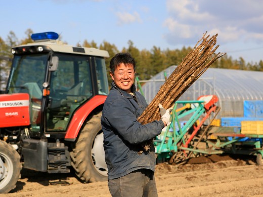 北海道の広大な農地を活かし、小麦・長芋・ゴボウ・馬鈴薯・キャベツ・スイートコーンなどを中心とした農作物を育てています。当農場にはGPS搭載のトラクターもあり、広大な農地で次にどこへ行くべきか誘導してくれるため安心です。小山農場のゴボウは、生でも食べることができ、春ゴボウは折ると水があふれるほどの水分量。ゴボウの糖度は普通14度~15度くらいですが、小山農園のゴボウはなんと糖度18度~最高値は24度!風味、香りが良いのが特長です。