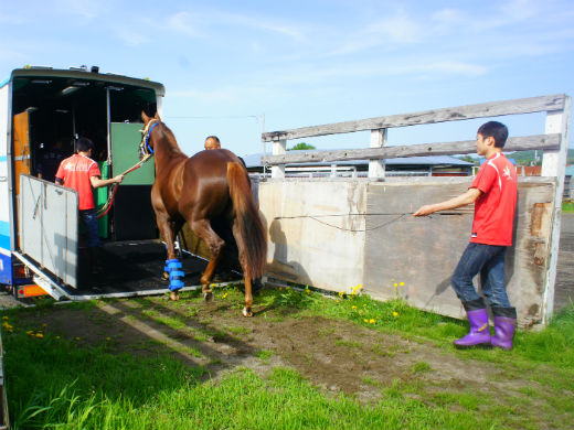 写真は、自分たちが仕上げた馬がレースに向け旅立つ瞬間。馬との日々が思い出され、とても感慨深い気持ちになりますよ。