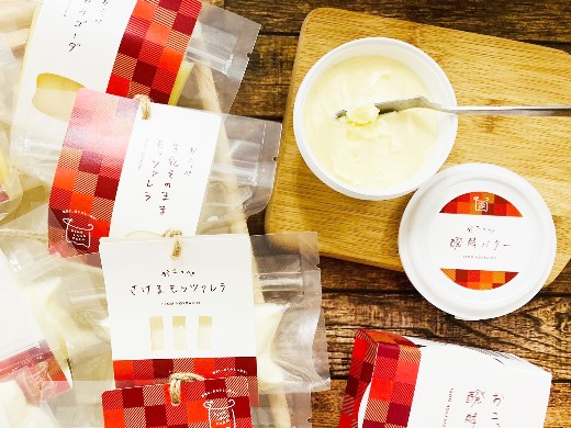 その日の朝の搾りたての生乳を使って、ソフトクリーム、焼き菓子、チーズ、バター等の製造・販売も行っています。牧場内には商品を販売するお店もあり、特に夏場の暑い時期には、ご家族やカップルなどたくさんのお客様で賑わいます。