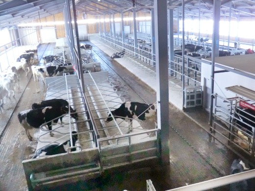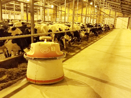 搾乳にはロボットを使用。搾乳の時間になると牛たちは機械に自ら入り、搾乳が開始し、終わると再び自ら牛舎に戻ります。通路に散らかった餌を寄せる作業もロボットが行い、ふん尿や汚れた敷料の搬出作業もベルト式の装置で行います。